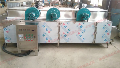 該機主要用于從冷卻機里面出來的蔬菜,表面有很多水珠,用于去除蔬菜表面的水珠,起到風干瀝水的作用。提高自動化程度高。從冷卻機里面輸送到風干機網(wǎng)帶上面的蔬菜,步行前進,網(wǎng)帶上下采用多組風機,對著蔬菜上下對吹,通過多次翻轉,對蔬菜進行風干瀝水,效果明顯,為后期烘干節(jié)省時間。