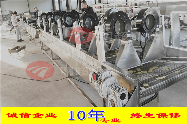 不銹鋼網罩:為防止產品過輕在風干時被吹飛,在輸送帶上方都加有沖孔不銹鋼網罩,產品只會在里面翻轉而不會被吹出。防飛罩可以拆卸,方便清理。電機功率0.37KW,風機功率0.75KW,風機16臺,吹風量1200/H(立方米),外形尺寸5000*1460*1250MM。 |