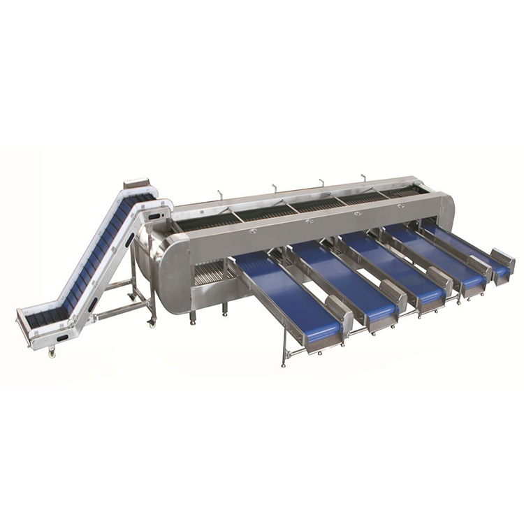 采用滾杠式的網帶互相交替分級,可分為5個級別,該機可按照果蔬的大小直徑進行分級,可分為多個級別,胡蘿卜在進行分級前,分級采用滾杠與滾杠之間的間隙進行分級,胡蘿卜和滾杠之間均有的行走中逐漸拉開距離,管與管之間距離逐漸擴大,所分級的產品由大到小分別漏下去,漏到設備下面的輸送帶上面,通過輸送帶輸送到筐子里面,分級過程中,不損傷胡蘿卜表皮,精度高,速度快,操作簡單。